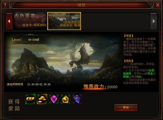 玩家每天可以参加一次世界BOSS活动。世界BOSS需要集合所有玩家一起战斗,玩家可以合作击杀BOSS。击杀BOSS后,所有参加活动的玩家可以获得奖励。